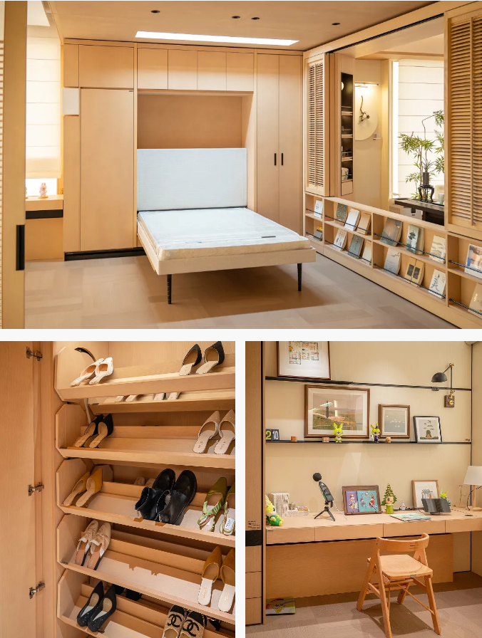 好的设计,始终服务于真实的生活。兔宝宝在整个家居空间中系统植入了适老化与人性化设计理念。入户区域设置的智能旋转鞋柜,有效解决多口之家的鞋物收纳难题;借鉴“八百库空间”理念,充分利用每一寸空间,灵活满足家庭的储物需求。儿童房内配备可调节书桌与榻榻米,伴随孩子不同成长阶段的需求变化。此外,规划合理的“衣柜—换洗—熨烫—护理”一体化动线,让家务流程更为顺畅;可移动书柜配合智能语音操控,轻松实现阅读、娱乐、聚会等多种场景的灵活切换。
