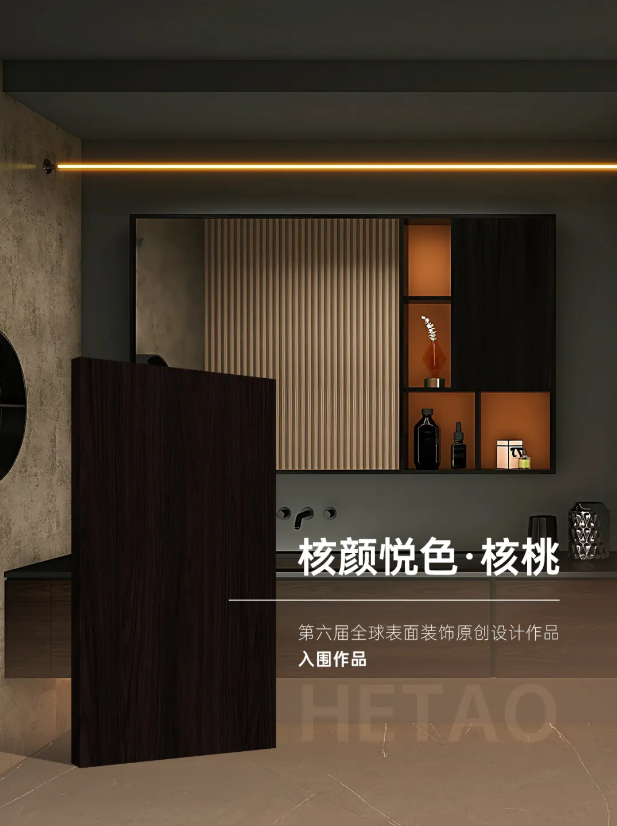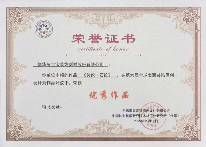 在本次原创设计秀中,兔宝宝报送的3款花色作品凭借独特的设计理念与出众的工艺呈现,全部成功入围,其中“劳伦·石纹”更是脱颖而出,斩获“优秀作品”荣誉,另外两款作品《核颜悦色·核桃》《陌上榆影》均获评“入围作品”。