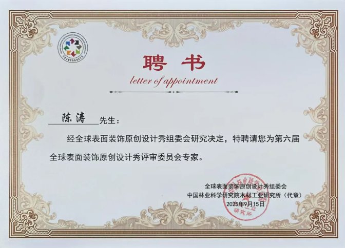 与此同时,公司花色开发部经理陈涛凭借深厚的行业积淀与专业能力,受邀特聘为“第六届全球表面装饰原创设计秀”评审委员会专家。该设计秀作为汇聚行业原创力量的核心活动,组建了由18位产业链资深人士构成的“作品入围专家评审团”,通过专业严谨的打分机制,从众多参赛作品中遴选出入围作品100款,成为大会期间的关注焦点。