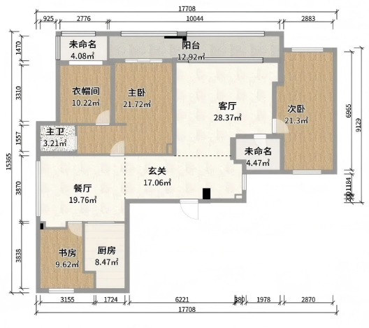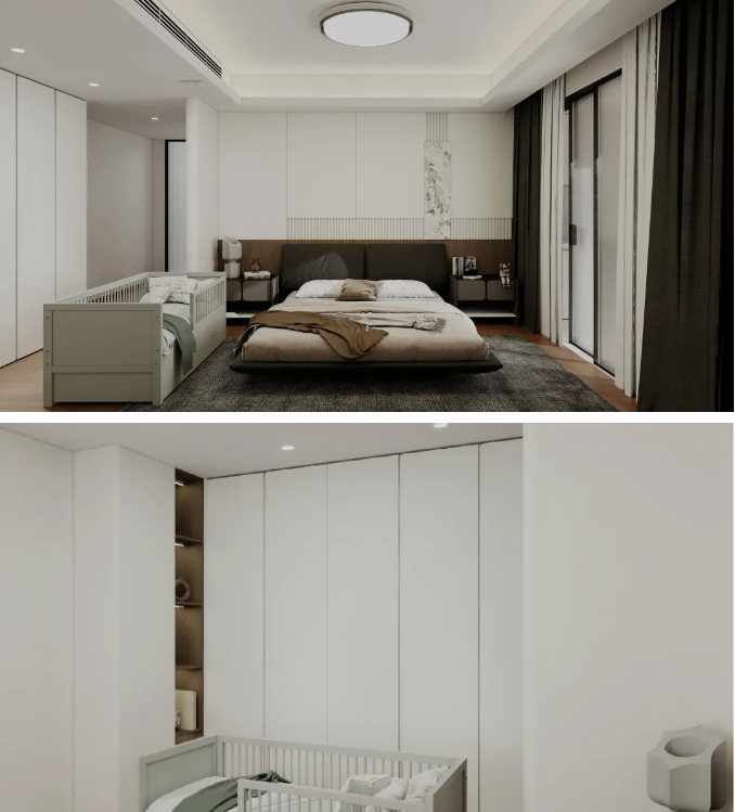 睡眠区:以低饱和度色彩(白色、木棕纹)和柔和纹理营造安舒氛围。预留婴儿床位置,体现对未来生活的细致考量。整墙到顶衣柜采用铣槽拉手,简约大气,满足日常收纳。