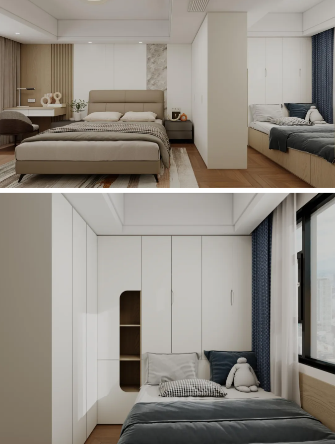 创新性地划分为主、次两个睡眠区,以应对外孙来访的居住需求。主区配置舒适软包床与一体化书桌,次区采用榻榻米储物床,兼顾睡眠与收纳。整体色调温馨,营造出共享天伦之乐又保有个人空间的温馨角落。