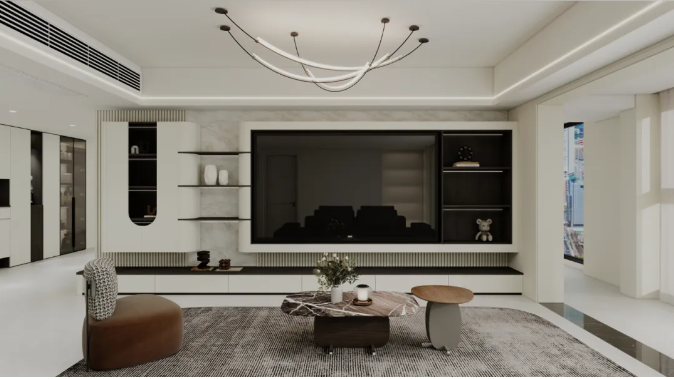 采用大开间设计,核心是长达5.5米的整墙电视柜,通过暖白柔光板与梧桐木色的体块穿插,整合巨幕视听、隐藏收纳与艺术展示功能。