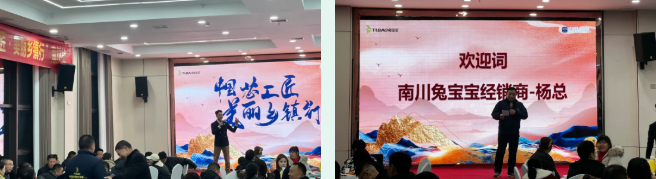 活动伊始,到场的木匠工人们以及各个合作伙伴陆续签到领取随手礼,在观赏兔宝宝企业宣传片的同时,享受精心准备的餐桌茶歇。随后,兔宝宝商学院主持人贺凯南准时登台开启开场白,简洁有力的致辞迅速点燃现场氛围。南川地区经销商杨总带来欢迎致辞,他衷心感谢大家在百忙之中出席活动,向长期以来支持与信任南川兔宝宝的合作伙伴们致以诚挚谢意,并表示南川兔宝宝自成立以来,始终秉持兔宝宝品牌精神与经营理念,致力于为当地消费者提供高品质家居产品与优质服务,见证无数家庭因兔宝宝收获温馨舒适的居住环境,这份成就让团队倍感骄傲。