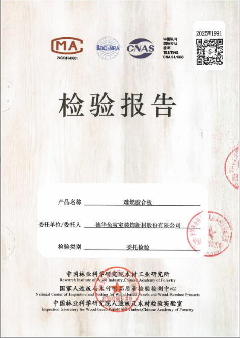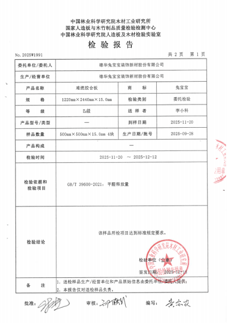 在守护生命安全的同时,兔宝宝同样关注居住者的健康。根据国家人造板与木竹制品质量监督检验中心依据 《GB/T39600-2021人造板及其制品甲醛释放量分级》 标准出具的检测报告显示,兔宝宝难燃胶合板甲醛释放量检测值为0.047mg/m³,达到国家E0级标准(≤0.050mg/m³),为孕婴、老人等敏感人群打造安心无忧的居住环境。