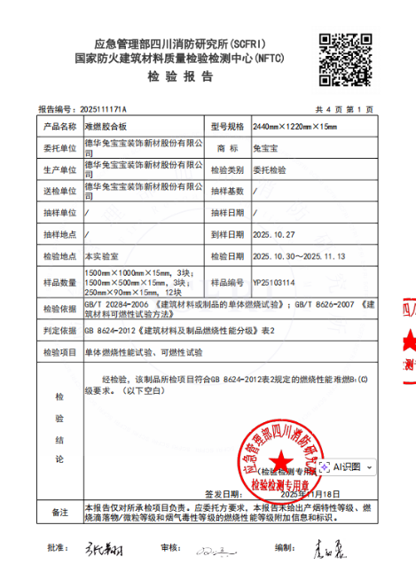 天安豪园二期作为上海备受关注的高端住宅,始终将“居住安全”与“品质生活”置于项目核心。从建材的甄选到施工的每一处落地细节,项目团队均力求极致。在众多建材中,兔宝宝难燃胶合板凭借防火性能与环保优势,成为该项目的优选材料。此次公证检测,正是对这一选择的一次公开、透明的验证。