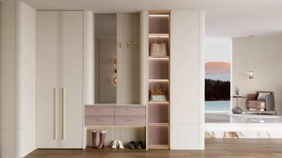 入户玄关,作为家人外出归来的“第一站”,也是病菌交叉感染的高发区域。用兔宝宝纯芯板打造的玄关柜,可有效阻隔包包、外套上携带的外界细菌,为家人筑起入门的首道健康屏障。