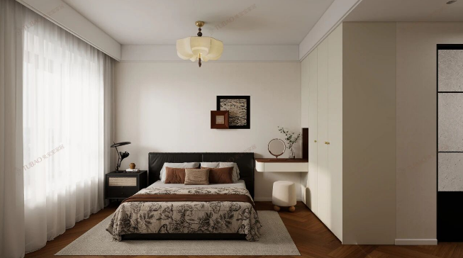 主卧延续了整体简约温润的格调,未做复杂造型,墙面依旧以奶咖色艺术漆打底,搭配一幅简约艺术画点缀。皮质软包床头触感细腻柔软,弧度贴合人体工学,往上面一靠,疲惫便瞬间消散。床头两侧采用不对称床头柜设计,打破单调,增添了空间的灵动性;一门到顶的衣柜设计,最大化拓展收纳空间,同时保持墙面整洁利落,让卧室更显宽敞整洁。