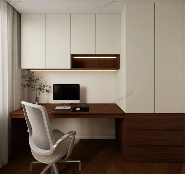 书房的设计以空间利用率为核心,顶天立地的柜体与书桌无缝衔接,将每一寸空间都发挥到极致。柜体分层设计清晰合理,让书房既有秩序感,又藏着满满的生活温度。
