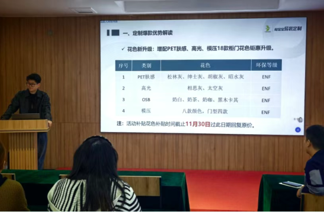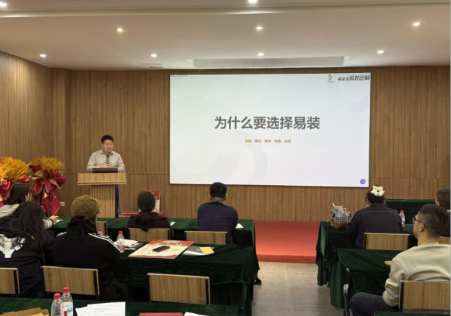 会议伊始,易装运营公司总经理助理王莫发表致辞。王总从行业发展趋势与公司战略布局的角度,对兔宝宝易装的未来发展进行了展望。他强调,随着消费者需求的不断升级,易装产品凭借其便捷、高效、个性化的优势,市场潜力巨大。公司将持续为经销商伙伴提供更优质的产品与服务支持,并鼓励大家要勇于创新营销模式,全力以赴实现双11既定目标。