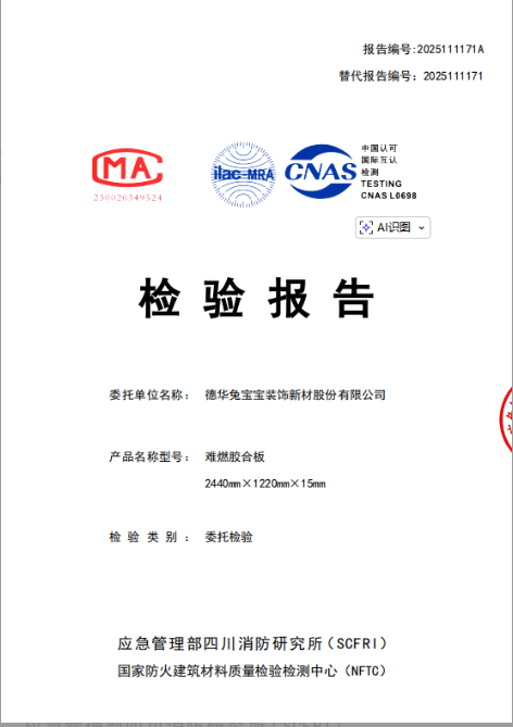 在守护生命安全的同时,兔宝宝同样关注居住者的健康。根据国家人造板与木竹制品质量监督检验中心依据 《GB/T39600-2021人造板及其制品甲醛释放量分级》 标准出具的检测报告显示,兔宝宝难燃胶合板甲醛释放量检测值为0.047mg/m³,达到国家E0级标准(≤0.050mg/m³),为孕婴、老人等敏感人群打造安心无忧的居住环境。