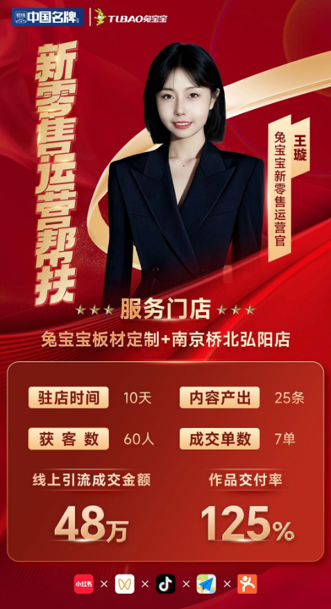 帮扶期间,运营专员以短视频为核心引流载体,结合兔宝宝品牌特色与南京本地消费需求,打造专属内容矩阵,由门店“板二代”张鑫担任账号出镜人,以年轻化、接地气的呈现形式传递品牌价值与产品优势,增强内容的亲和力与传播力。截至一季度末,共计产出优质短视频25条,通过精准内容运营与投流优化,成功实现有效获客60人,线上引流转化金额突破48万元,为门店注入了强劲的增长动力。