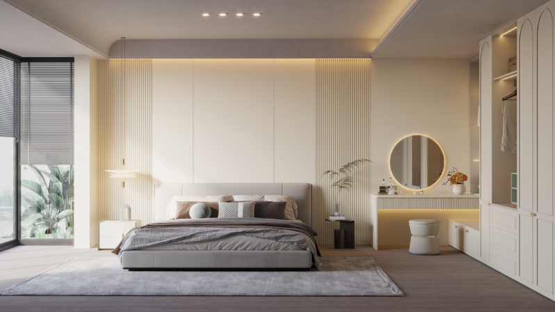 卧室是孩子专属的私密空间,更是TA卸下疲惫、积蓄能量的港湾。为了给孩子打造良好的休息环境,卧室的装修以柔和的色调为主,浅蓝、米白的墙面搭配温暖的灯光,营造出宁静舒适的氛围。床头的小书架上放着孩子睡前喜欢读的绘本,床边的衣柜设计了分层收纳区,上衣、裤子、袜子分类摆放,方便孩子自己整理衣物,在动手过程中养成良好的生活习惯。
