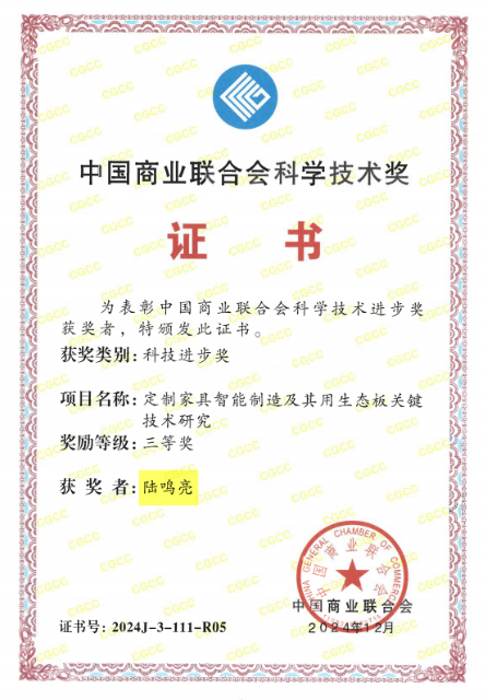 陆鸣亮作为主要起草人之一,参与16项国家、行业和公司标准的制定工作,涵盖产品质量、安全环保、技术规范等方面。其中,兔宝宝实木地板和实木复合地板标准,入选 2024年企业标准“领跑者”名单;“定制家具智能制造及其用生态板关键技术研究”获2024年度中国商业联合会科学技术奖三等奖。