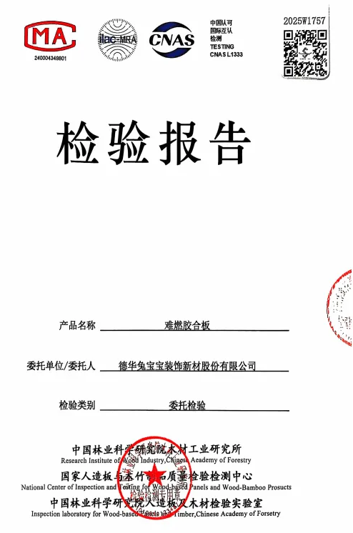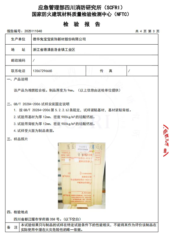 近日,我们已收到国家防火建筑材料质量监督检验中心与国家人造板与木竹制品质量监督检验中心的检测报告。报告显示,兔宝宝难燃胶合板在燃烧性能和环保指标上均表现出色,远超国家标准,以实实在在的数据验证了为建筑安全构筑生命防线的承诺。