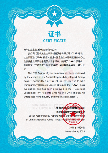在全球气候变化和环境问题日益严峻的今天,绿色发展已成为企业社会责任的重要组成部分。作为中国装饰板行业首家上市公司,兔宝宝自1992年成立以来,始终以推进行业绿色进程为己任,积极履行企业责任与担当。近年来,随着双碳目标持续深入,公司紧密围绕国家战略导向,聚焦家居建材行业转型需求,将ESG理念深度融入企业发展战略。近期,兔宝宝凭借在环境、社会与治理(ESG)领域的深耕与实践获得多项权威认可:入选《2025中国企业绿色转型实践报告》、《“工信千家”优秀可持续报告》,并荣获“2025年度上市公司ESG价值传递奖”。这些荣誉,既是对过往履责成效的肯定,亦是对未来持续引领的期许。