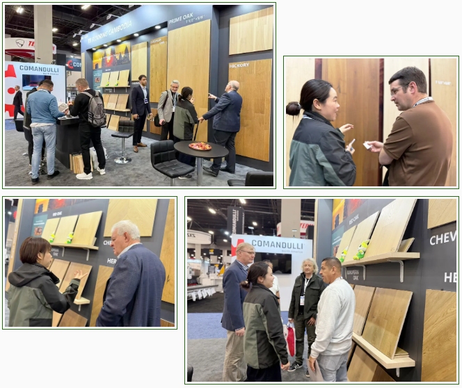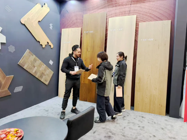 此次兔宝宝展出的地板产品丰富多元、亮点纷呈,涵盖欧橡、山核桃、橡木等高端木地板品类,以齐全规格与多元设计响应国际市场对个性化和高品质的追求。其中,异形拼花地板、化染长宽板、红橡“不红”高等级地板三款特色产品脱颖而出,成为展会焦点。异形拼花地板通过精湛的制作工艺,拼接成富有艺术感的几何或自然图案,契合高端市场对个性化产品的追求;化染长宽板运用化工染色技术,在完整保留木材天然肌理质感的同时,赋予产品更多色彩选择;红橡“不红”高等级地板则通过工艺迭代创新,打破传统红橡的色彩局限,精准匹配国际市场对多风格木材材料的差异化需求。