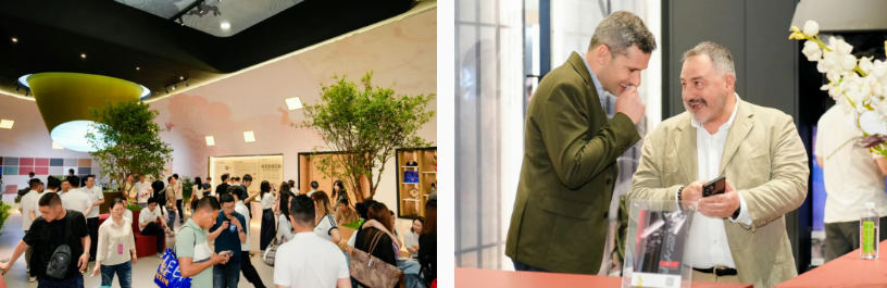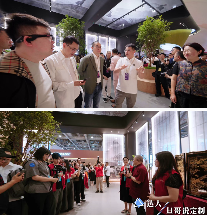 本次展馆以「兔启东方・匠造无界」为核心主题,以深色系为基调,运用柔和流畅的弧形线条,打破传统展厅的方正边界,从外观至室内,构建出一个兼具东方韵味与现代质感的沉浸式空间。非遗器物的细腻纹理、板材的温润质感与弧形墙面的灵动线条,在明暗光影的交织中层层递进,营造出富有立体感的空间体验。每一位步入其中的观展者都能在静谧中感受到东方美学的张力与品牌对匠心的极致追求。正是这种将文化底蕴与现代设计无缝融合的能力,让兔宝宝展位在展会期间始终人头攒动,成为全场当之无愧的流量高地。
