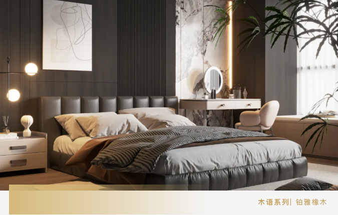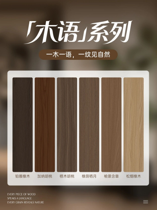 松烟橡木、橡荫栖月、铂雅橡木、榆景含章、栖木胡桃、加纳胡桃六大核心花色,紧密贴合当下主流家居色彩趋势,涵盖暖调温柔、中性大气、深棕沉稳、雅致高级灰等多种色调,完美适配现代高定、简约清爽、轻奢质感、新中式雅致等多元家装风格,无论业主偏爱清浅温润的治愈感,还是偏爱深沉内敛的高级感,都能在木语系列中找到适配自己的理想木色。