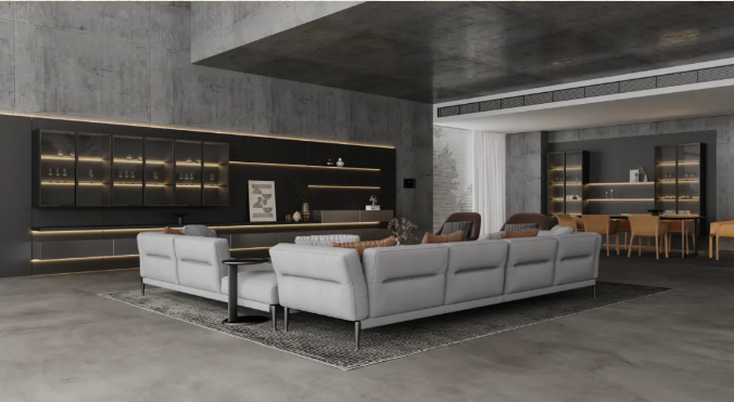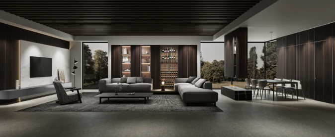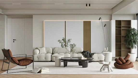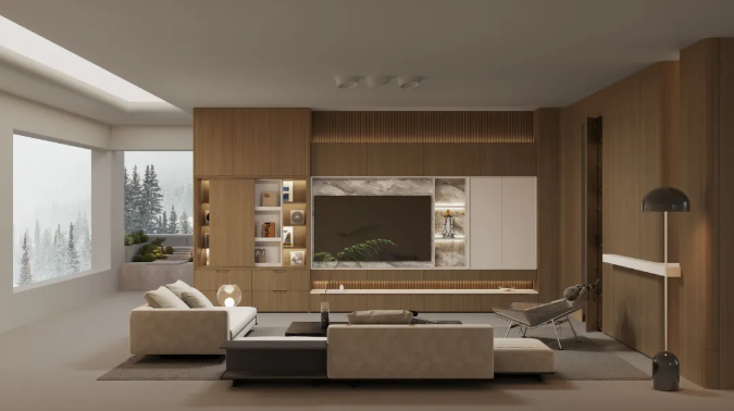 轻社交模式:社交与收纳的满分答案!电视墙嵌入电器柜“隐身”杂乱,沙发墙组合展示柜与隐藏储物,隐藏式收纳让杂物“消失”,观影时秒变家庭影院;
