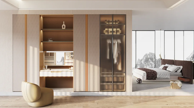 悦己悦生活:玻璃展柜,一目了然,打造每日出门的专属秀场;45°斜口磁吸静音门,隔绝纷扰,构筑静谧休憩的私享静音舱。顶天立地衣柜,奢藏井然有序。