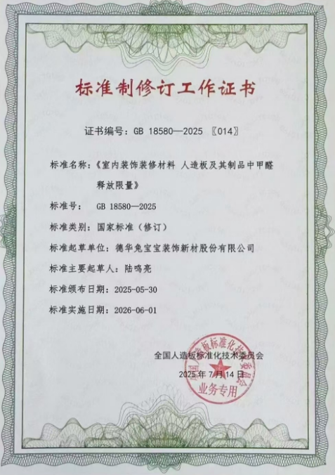 陆鸣亮作为主要起草人之一,参与16项国家、行业和公司标准的制定工作,涵盖产品质量、安全环保、技术规范等方面。其中,兔宝宝实木地板和实木复合地板标准,入选 2024年企业标准“领跑者”名单;“定制家具智能制造及其用生态板关键技术研究”获2024年度中国商业联合会科学技术奖三等奖。
