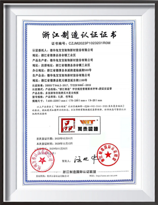 作为浙江制造业的标杆,“浙江制造”品字标认证以“高标准、严要求”著称,认证标准涵盖品质卓越、自主创新、产业协同、社会责任四大核心维度,普遍高于国家标准与行业标准。兔宝宝实木复合地板能够顺利通过如此严苛的认证,意味着产品的技术指标已经达到“国内一流、国际先进”水平,为消费者提供了更可靠的信赖背书。