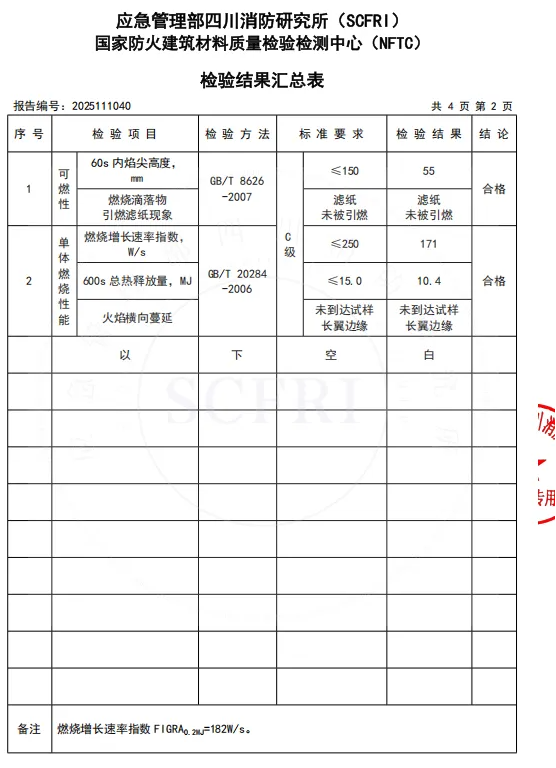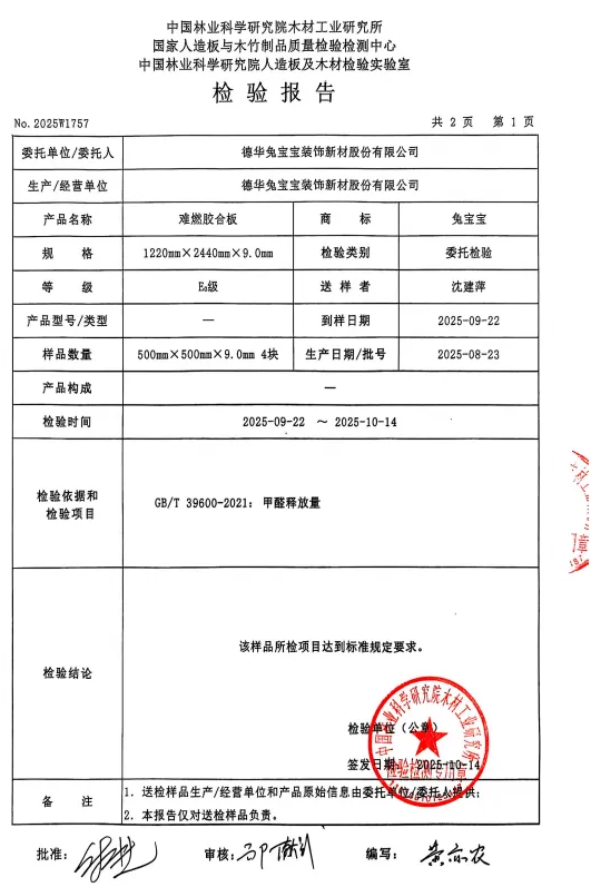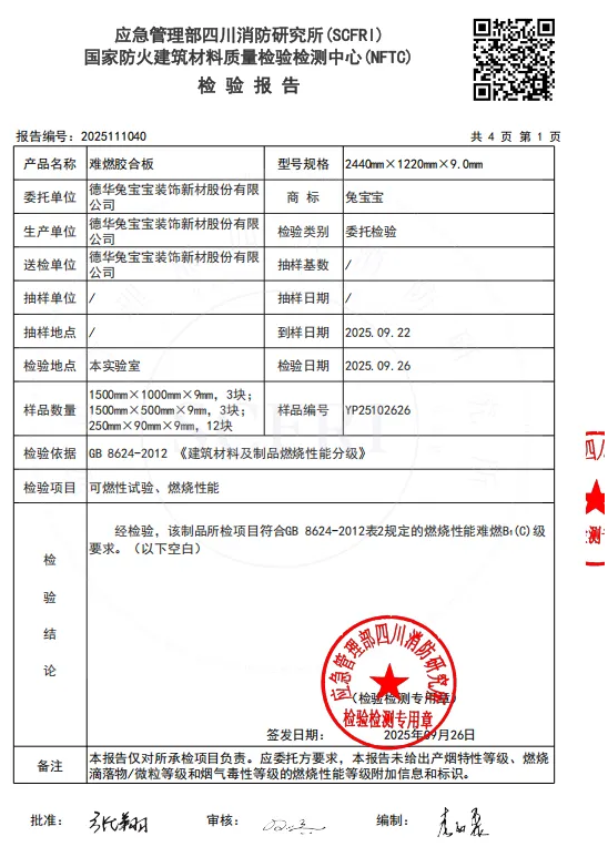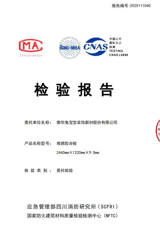 近日,我们已收到国家防火建筑材料质量监督检验中心与国家人造板与木竹制品质量监督检验中心的检测报告。报告显示,兔宝宝难燃胶合板在燃烧性能和环保指标上均表现出色,远超国家标准,以实实在在的数据验证了为建筑安全构筑生命防线的承诺。