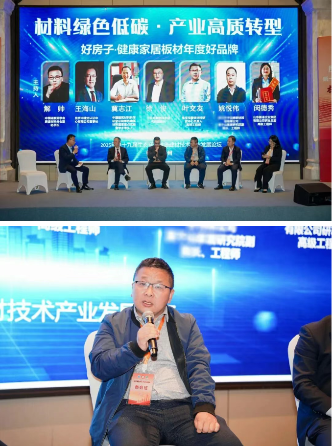 在大会核心环节“好房子・健康家居板材年度好品牌”专家访谈中,兔宝宝研发中心负责人叶交友代表企业发声,会议围绕“绿色低碳与高质转型”主题,系统分享了企业的实践路径与行业洞察。