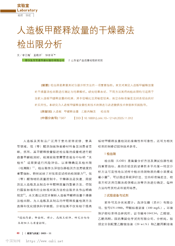 《人造板甲醛释放量的干燥器法检出限分析》(发表于《质量与认证》2025年 第11期)▼▼▼