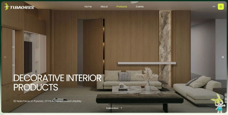为更好地展现品牌内涵与实力,国际站对网站架构进行了系统性梳理。通过简化交互路径、科学规划导航栏目,全新设立了“首页”“关于我们”“产品”“大事件”等核心板块,全方位、多维度地展示兔宝宝的品牌故事、产品矩阵与发展历程。