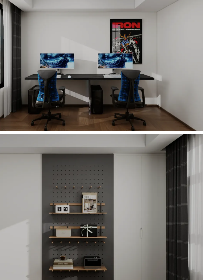 为年轻业主定制的专属领域。一字型电竞桌支持多显示器办公与游戏,人体工学椅保障舒适性。嵌入式储物柜解决设备与线材收纳,维持空间整洁与科技感,成为工作与娱乐完美结合的活力站。
