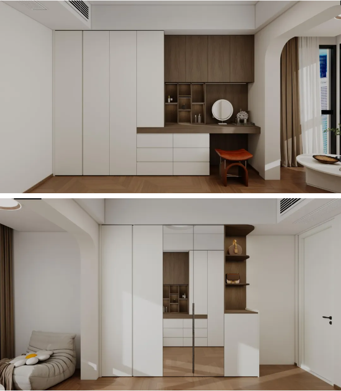 衣帽间与梳妆区:将收纳、梳妆与仪容审视功能高效集成。通顶衣柜采用镜面与木纹拼接,延伸空间感并替代穿衣镜。嵌入式梳妆台搭配灯带,打造明亮实用的美妆角落。