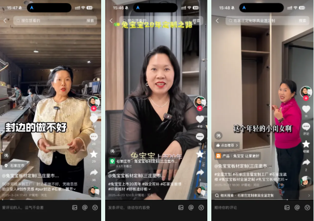 在门店的新零售转型中,出镜人员邓姐成为了意外的 “流量王牌”。没有刻意的表演痕迹,邓姐就像身边亲切的邻居阿姨,用朴实无华的语言分享兔宝宝产品知识、装修避坑技巧,偶尔穿插生活日常,瞬间拉近了与网友的距离,建立起极强的信任感。