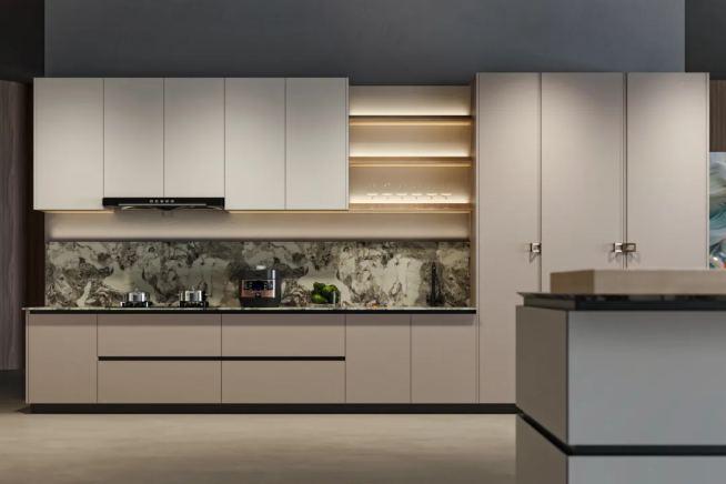 低饱和浅调弱化油烟视觉感,让厨房始终保持通透清爽。极简一体柜体精准利用转角、吊柜等每一寸空间,预设嵌入式家电位、分层抽屉、拉篮式收纳等实用布局,轻松实现“颜值在线+操作省心”,让每日下厨都成为治愈的日常。