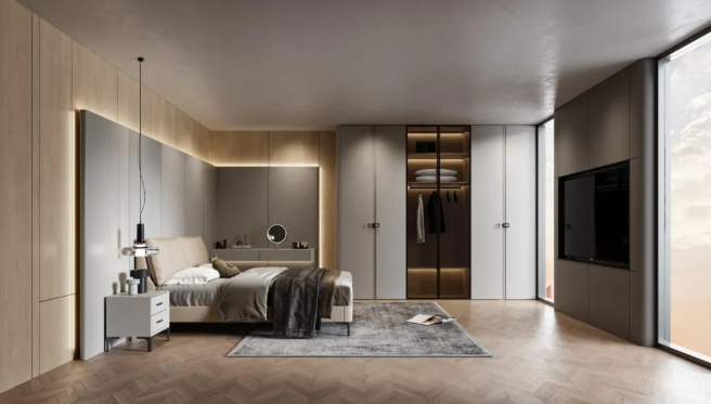 定制衣柜采用极简推拉门设计,内部挂衣区、叠放区、抽屉式收纳区科学分区,轻松容纳四季衣物与被褥;同系列床头柜简约利落,兼顾置物与充电需求,让小物件整齐归置。低饱和色调营造出松弛的休憩氛围,每一次入眠都成为治愈体验。
