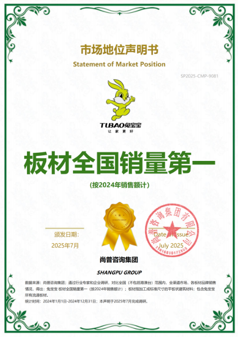 质领家居建材新时代,匠筑国民好品牌。兔宝宝将继续以匠心致初心,为更多家庭筑造健康、环保、高品质的家居空间,让家的每一处细节都值得托付。