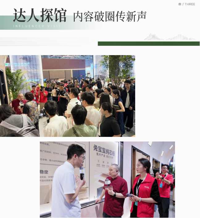 兔宝宝达人媒体探馆活动精彩开启,为品牌声量再添热度。新华社、新华网、央广网、环球网、中国质量新闻网等权威媒体,以及“旦哥说定制”“王诚讲定制”“泛家居”“定峰汇”“轻高定有基会”等几十名行业头部达人沉浸式探访展馆,以多元视角捕捉东方匠心与现代高定的交融瞬间,从专业产品解读到生活化场景表达,多平台优质内容同步释放,实现线上线下深度共振。