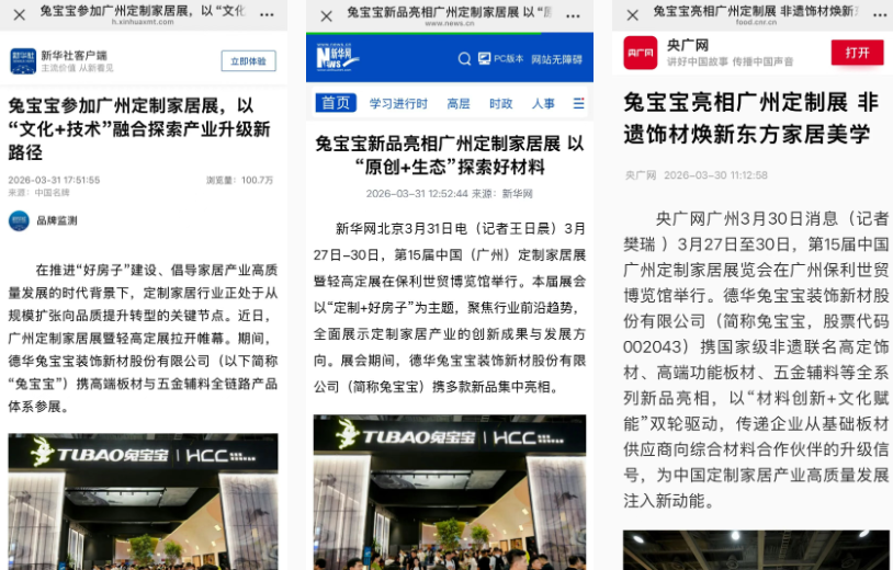 2026年3月27日—3月30日,为期四天的第15届广州定制家居展圆满落幕。本届展会以“好房子”为核心方向,聚焦人居品质升级与行业新趋势,汇聚全国优质品牌共探发展新机。兔宝宝紧扣展会主题,携非遗新品、全链路产品矩阵与多维赋能体系,成为展会期间备受关注的标杆品牌。