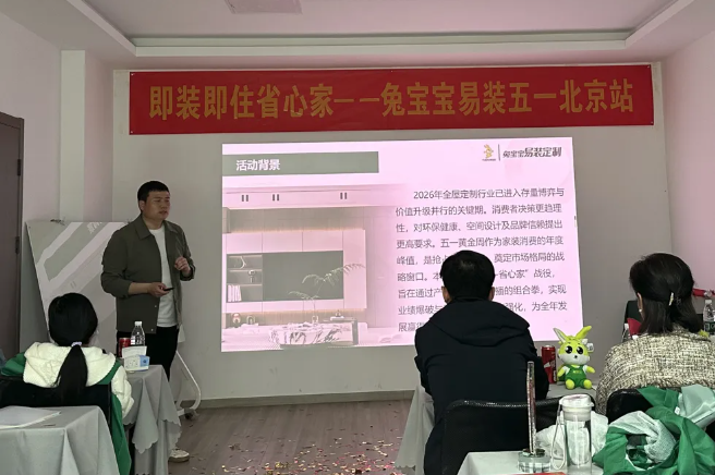 为全面打响兔宝宝易装五一营销攻坚战,4月15日,兔宝宝易装五一活动启动会北京站成功召开。兔宝宝易装运营公司、易装北京加工中心以及北京区域全体经销商伙伴齐聚一堂, 统一作战思想、明确活动目标,共同擘画五一旺季营销蓝图。