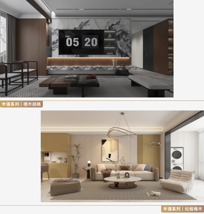 松烟橡木、橡荫栖月、铂雅橡木、榆景含章、栖木胡桃、加纳胡桃六大核心花色,紧密贴合当下主流家居色彩趋势,涵盖暖调温柔、中性大气、深棕沉稳、雅致高级灰等多种色调,完美适配现代高定、简约清爽、轻奢质感、新中式雅致等多元家装风格,无论业主偏爱清浅温润的治愈感,还是偏爱深沉内敛的高级感,都能在木语系列中找到适配自己的理想木色。