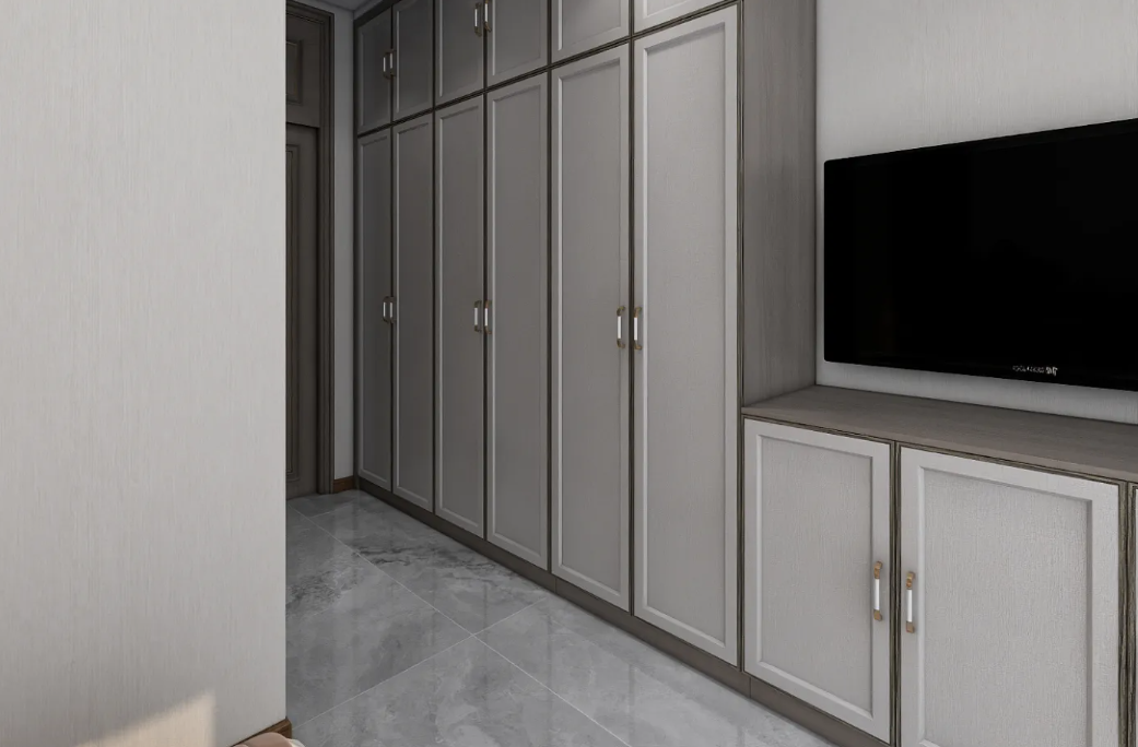 应用建议:柜门可以选择纯色板材,柜体可以选择同色系或略深的木纹板材,形成层次感。避免过多复杂的线条和装饰,保持整体简洁。