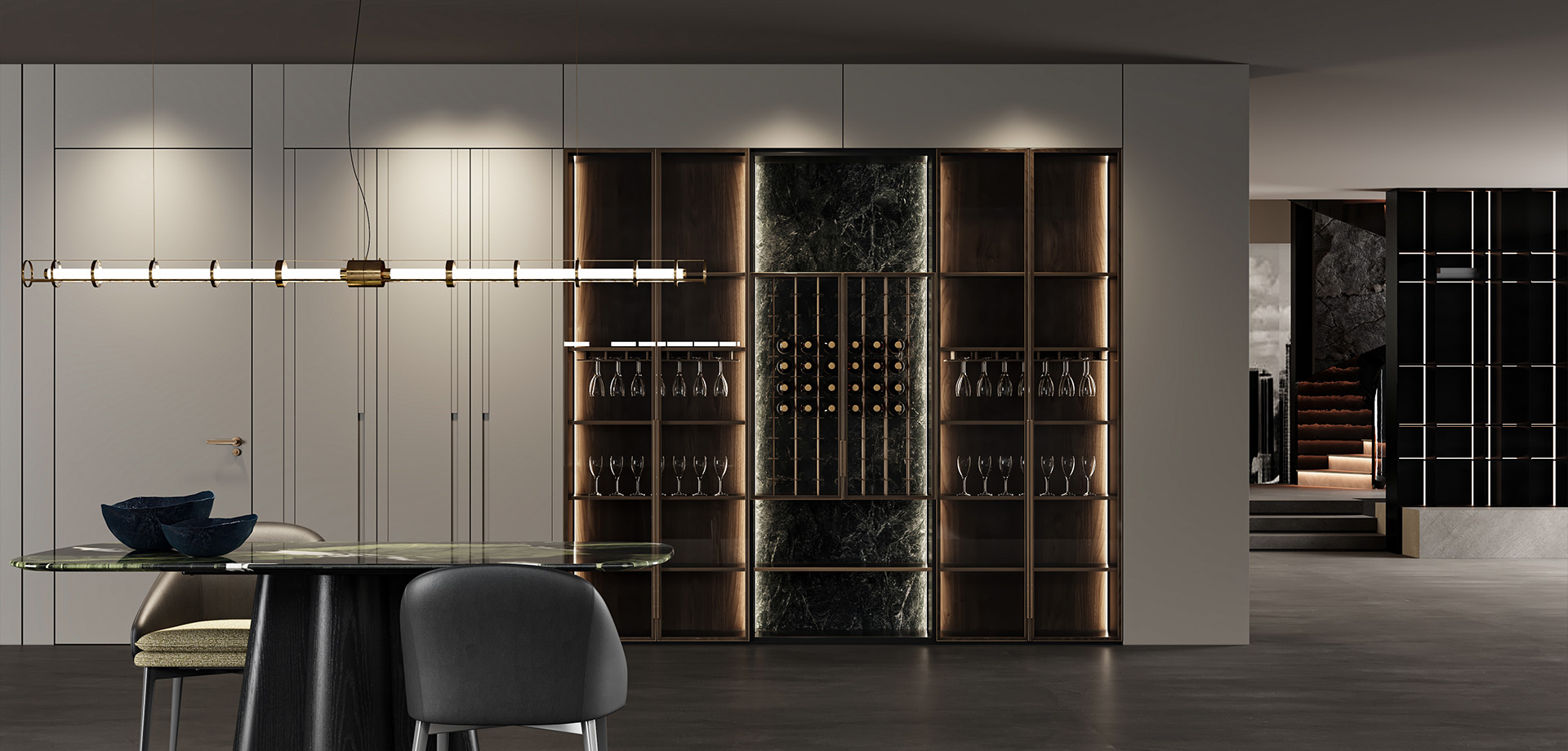 以深棕色作为空间过渡与社交焦点, 质感材质让功能空间具备设计表达。